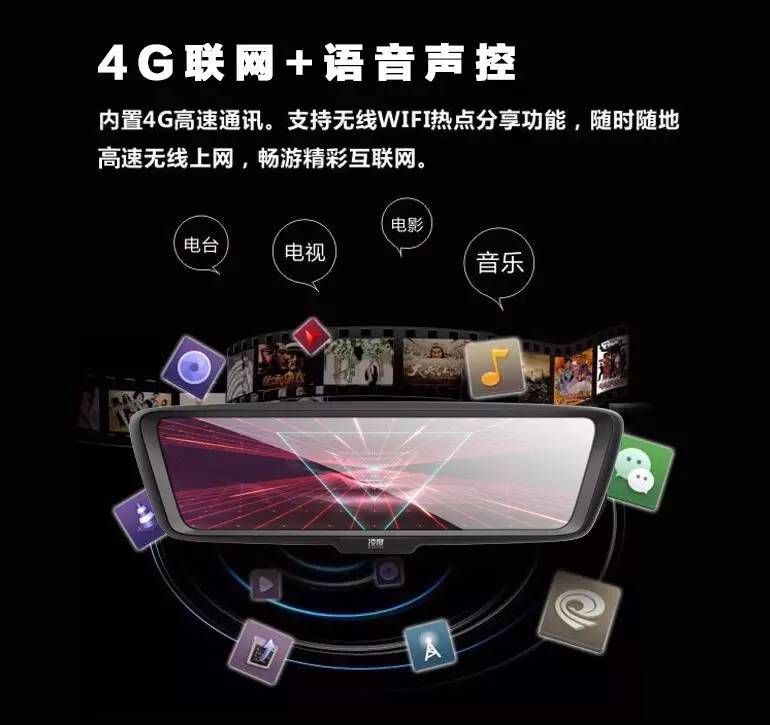 4G流媒体后视镜拥有9.88英寸全屏显示/语音声控/三倍视野/强 光抑制/前后双视/4G网络/无线蓝牙/远程监控/轨迹查询/GPS定 位/微信助手等产品特性及功能。